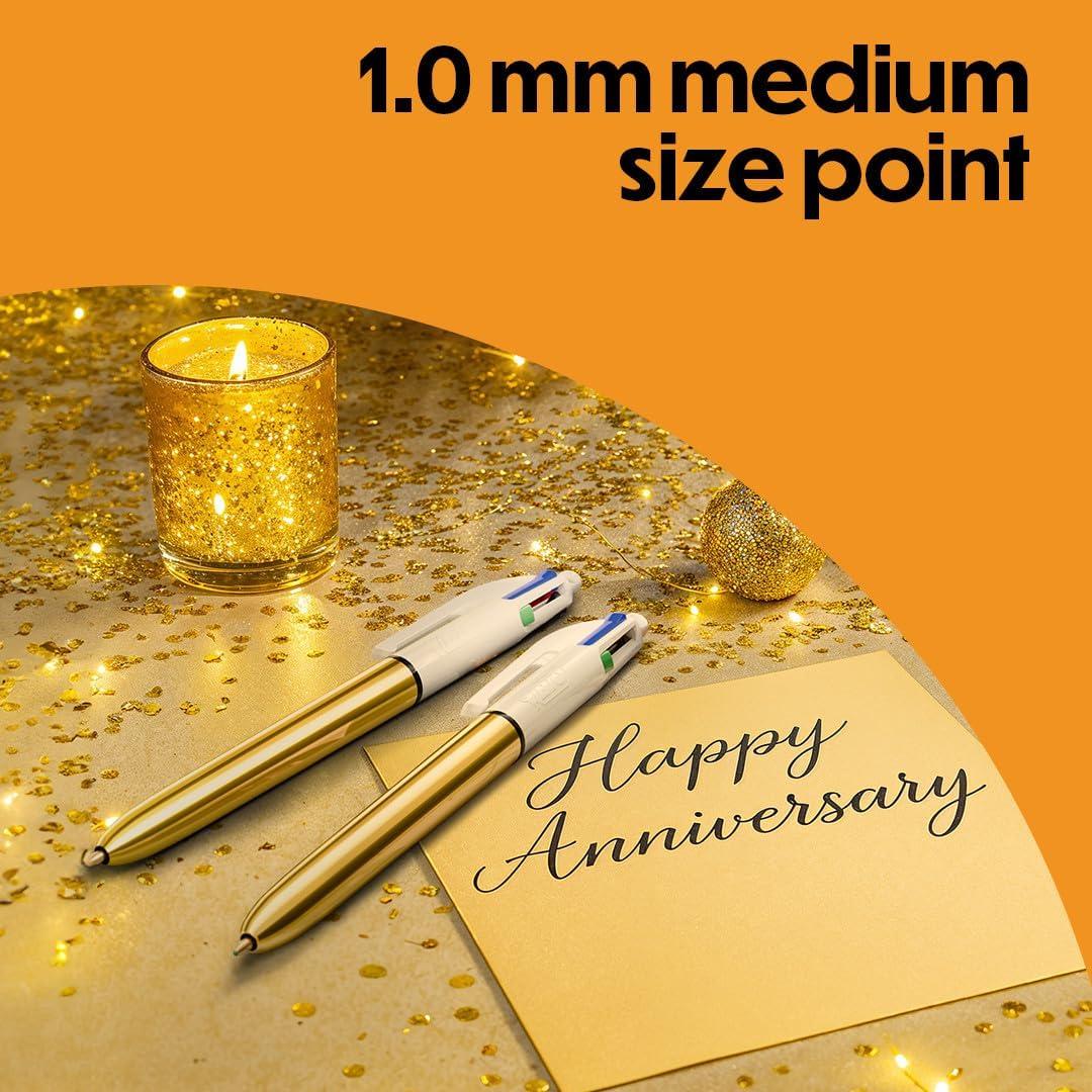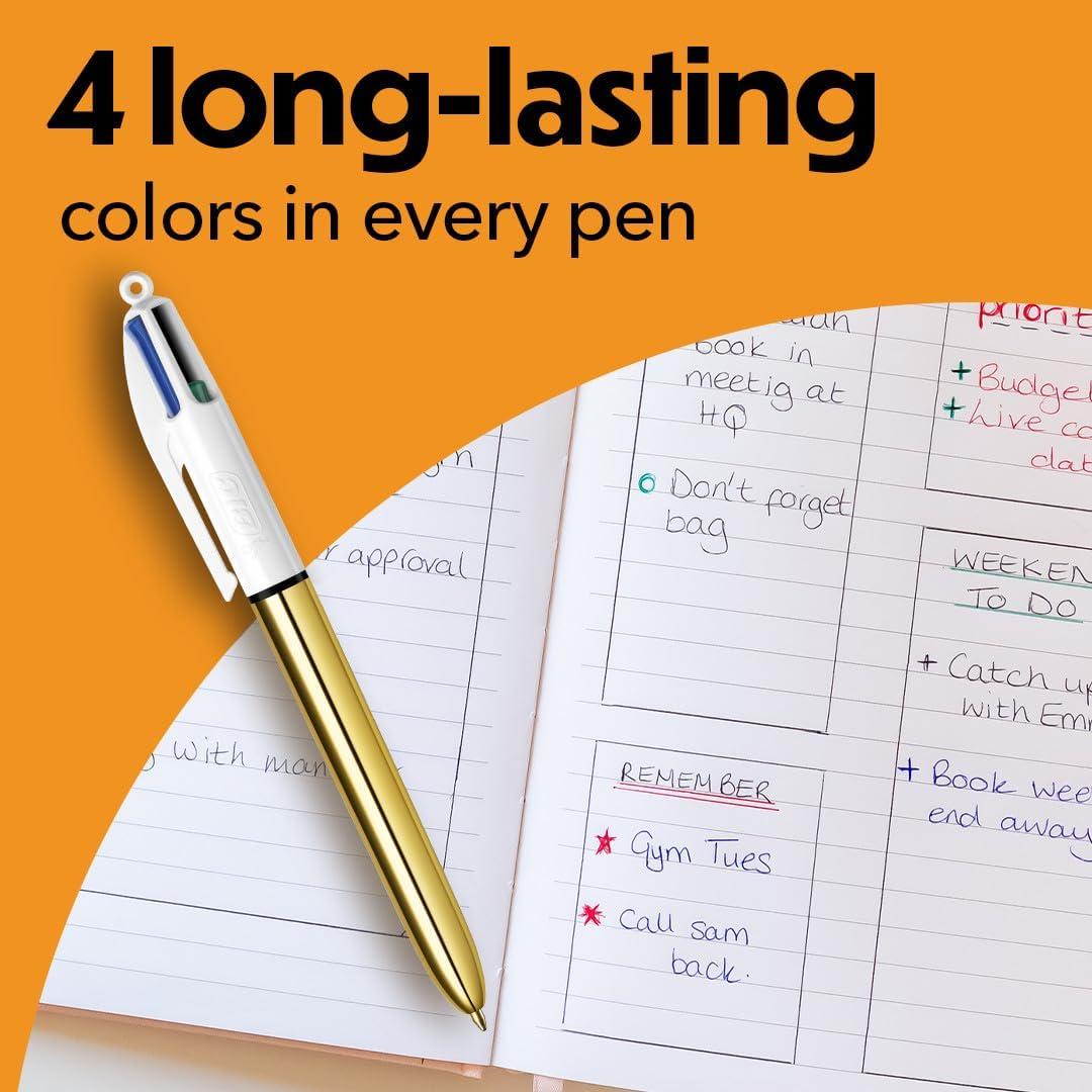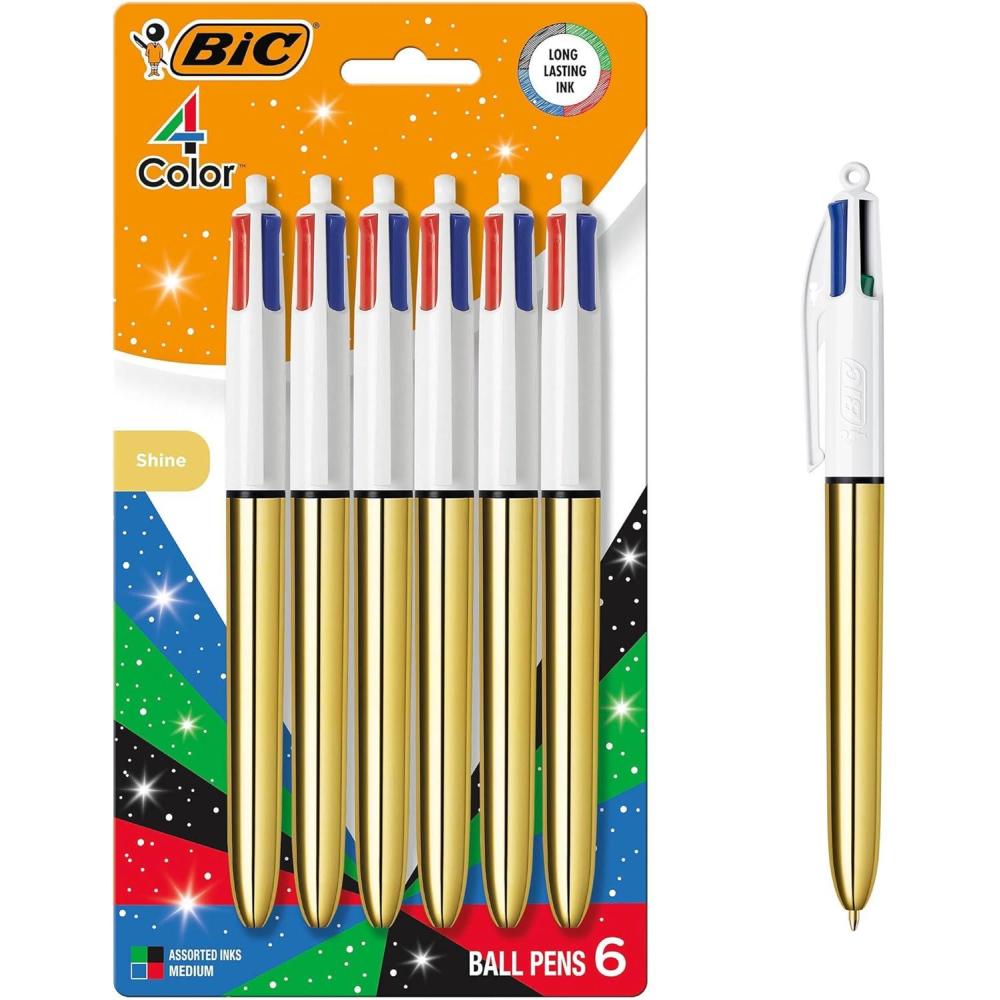 WHAT'S INCLUDED: Pack of six (6) BIC 4-Color Shine Retractable Ballpoint Pens with assorted ink colors in metallic gold barrels