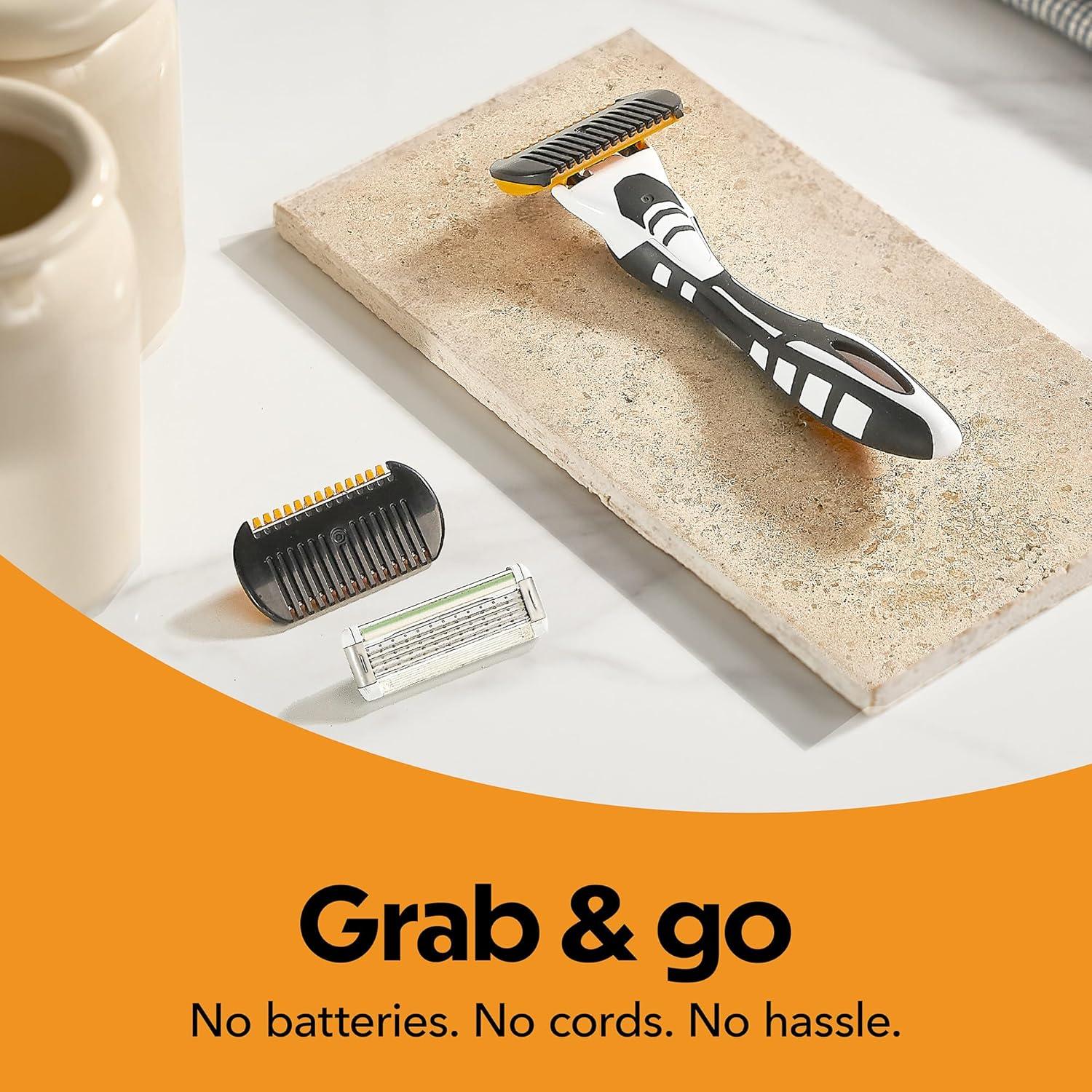 Trim, shave, and shape with the BIC Flex 5 Trim + Shave Beard Trimmer for Men. This all-in-one hair trimmer grooming kit comes with 1 handle, 3 mens razor cartridges, and 6 trimmers, perfect for beard lines, mustaches, sideburns, neckline, stubble and chest. Better yet, no batteries or chargers are required. For areas that need an ultra-close, comfortable shave, use the BIC Flex 5 Sensitive mens razor as usual. The 5 long-lasting flexible blades combine with a lubricating strip enriched with vitamin E, aloe vera, and licorice for a smooth shave. Snap on the trimming attachment and choose between 2 modern sophisticated looks: the 0.5 mm side creates an alluring 5 o’clock shadow and the 1.5 mm side trims to a neat 3-day stubble. Complete your look by shaping with the precision edging blade for detailed styling on beards, sideburns, mustaches—anywhere on the face or body that needs clean lines. Re-trim every 1-2 days to maintain your style. Each Flex 5 Trim + Shave razor gives you up to 13 shaves per razor*. *Average shave frequency 3 times per week